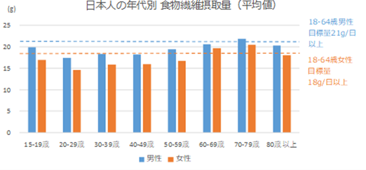 日本人は食物繊維の摂取量が少なく、特に60歳未満の年代層では食物繊維の摂取が低いことがわかっています。厚生労働省の「日本人の食事摂取基準(2020年版)」では食物繊維の1日の摂取の目標量は、男性21g以上、女性18g以上(ともに18〜64歳)とされていますが、「令和元年国民健康・栄養調査報告」から20~59歳では、1.2~3.5g程度が足りていません。