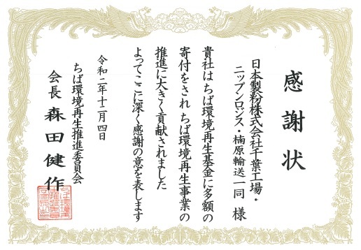 Our Chiba Mills, and our partner companies NIPPN LOGIS Co., Ltd. and KUSUHARA Transport Co., Ltd. supported the importance of the Chiba Environmental Restoration Promotion Committee, which promotes the preservation and restoration of nature in Chiba with the participation of all Chiba residents, and aims to make Chiba the "Best Environmental Prefecture in Japan." So they made a donation to the Chiba Environment Restoration Fund and received a certificate of appreciation from the committee.