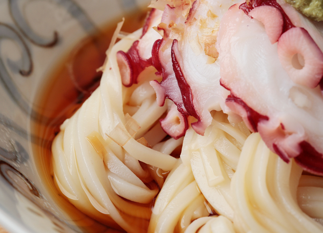- 丼に①の讃岐ざるうどんを盛り、②のたこ、軽く水気を絞った大根おろし、わさびをのせる。