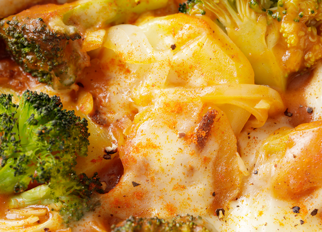 - グラタン皿に②の野菜を盛り、濃いクリーミーボロネーゼを全体にかけ、ラップをふんわりとかけて電子レンジで再び2分程加熱し、ソースを温める。
