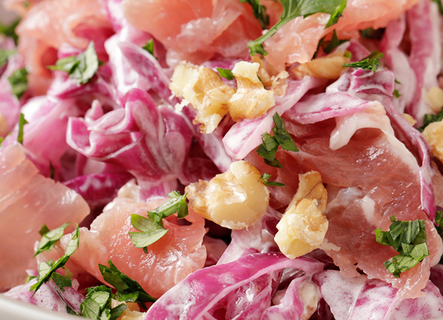 - くるみは粗めに砕き、生ハムは小さめに手で裂き、②に加えてさっと混ぜ合わせる。あればお好みでパセリのみじん切りを散らす。
