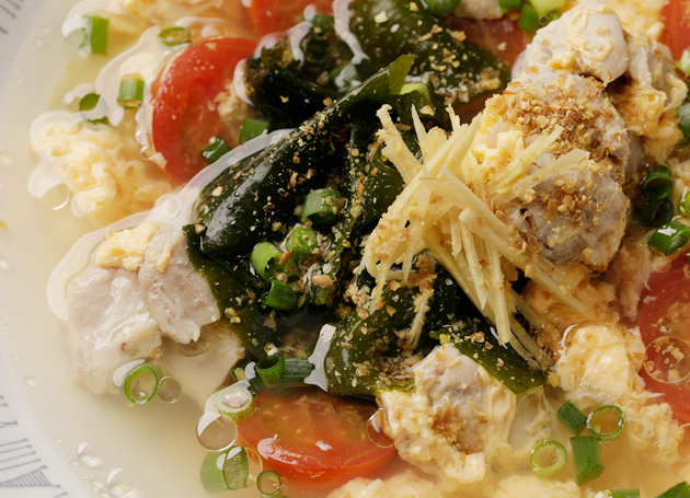 鶏もも肉をそのままだし汁で茹でるよりも、一度塩水で蒸し煮にすることで、鶏肉自体も味わい深く、鶏のスープもよりしっかりと出ます。だし汁との合わせだしに、わかめや野菜を加え、更にアマニ油や粒を仕上げに加えれば滋養たっぷりの美味しいスープに。ごはんを加えてクッパ風にするのもおすすめです。