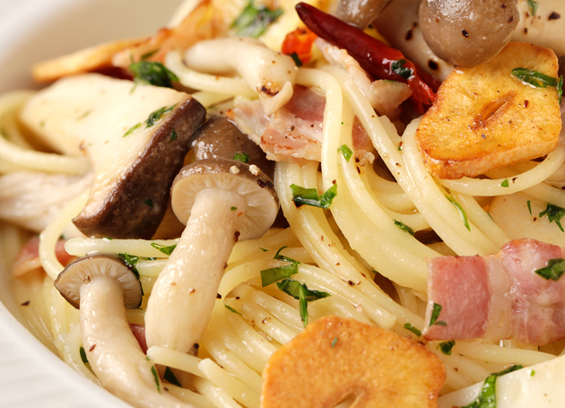 - フライパンにエキストラバージンオリーブオイル、にんにくを入れて弱火にかけ、薄く色づいたら、中火にして赤唐辛子、ベーコン、きのこを加えて炒め合わせる。
