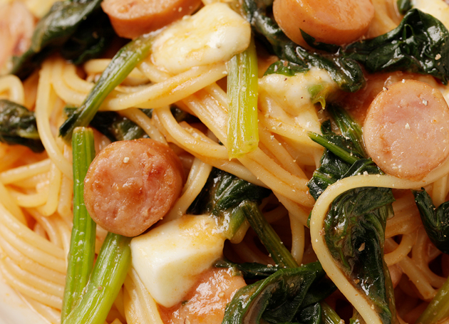 - フライパンにエキストラバージンオリーブオイルを熱し、ソーセージを炒める。更にほうれん草を茎、葉の順に加えて炒め合わせる。