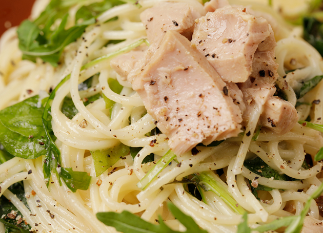 - 水気を切ってボウルにあけ、ツナ缶、レモンを絞り入れ、バター、醤油、ベビーリーフを加えて全体にざっと混ぜ合わせ、器に盛り、黒胡椒を挽きかける。