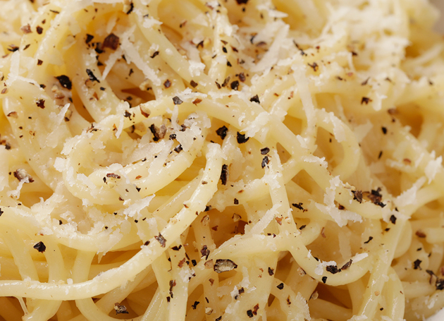 - フライパンに茹で汁50㏄程、エキストラバージンオリーブオイル、バターを入れて弱火で溶かし、①のスパゲッティ、粉チーズを入れてよくかき混ぜ、ソースを乳化させる。