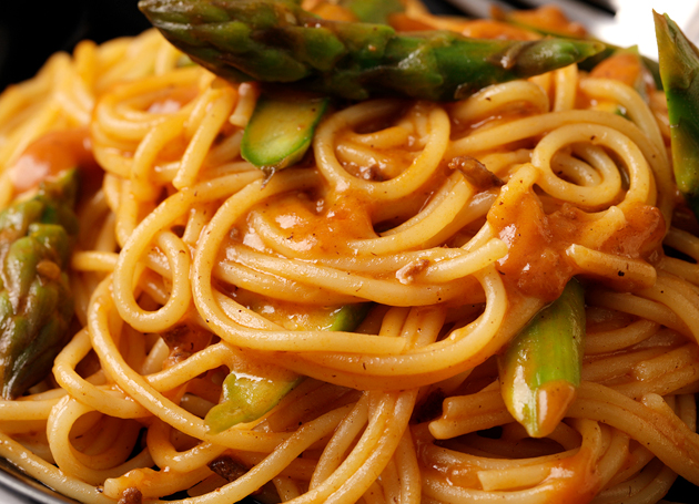 - たっぷりの湯に塩を適量入れ、スパゲッティを表示どおりに茹でる。残り2分程前にアスパラガスを入れて一緒に茹でる。