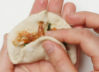 - [1]を10等分にし、めん棒で丸くのばし、真ん中に[2]を適量のせて包み、まわりの生地をたぐりよせるようにして包み、閉じ目をぎゅっとつまんでしっかりと閉じし、閉じ目を下にして手の平で押さえて平らにする。