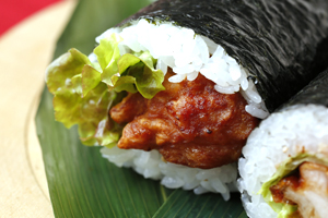 - まきすに海苔、すし飯(※のりしろ分1cm開ける)、白ごま、刻んだ甘酢生姜、サニーレタス、から揚げを順に半量ずつのせ、マヨネーズを絞って巻く。