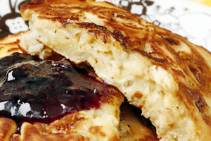 - フライパンを加熱してバターを入れて溶かし、弱火にして②を適量ずつ流し入れ、ひっくり返したら蓋をして数分蒸し焼きにする。(約4枚分)